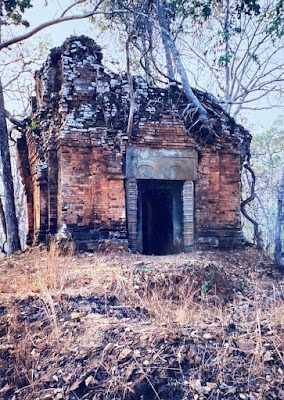 In March, my brother Tim and I managed to cram a visit to 20+ temples at the Koh Ker complex, in just over half a day. This was a world away from my first-ever visit in late 2001 when landmines made it impossible to visit pretty much anything other than the state temple, Prasat Thom. On my third visit in January 2005 many more temples had been demined though the red skull and crossbones warning signs were still stopping you from wandering off into the forest. Take for example, the single brick sanctuary of Prasat Kraham, which means Red temple, though not to be confused by the grander temple of the same name inside the Prasat Thom complex, further north. The track from the road to the temple and a twenty-meter perimeter around the solitary temple had been cleared of landmines, but venture no further was the stark warning back then. Today, demining is still taking place at Koh Ker, albeit in much less obvious locations. Prasat Kraham isn’t one of Koh Ker’s big-hitters and will be ignored by most visitors, so here is a look at the temple from my March visit and back in 2005. It’s located on the left just after you take the eastern turn-off from the main access road and begin your loop around the temples surrounding the man-made baray known as Rahal. Take into account that the frenzied building of the temple complex of Koh Ker, with well over fifty temples, took place within a twenty-year timespan in the second quarter of the 10th century, under the stewardship of King Jayavarman IV. He brought his capital to Koh Ker, some 120 kilometers northeast of Siem Reap, for the briefest of stints before his son returned the royal court to Angkor. Prasat Kraham was one of the lesser lights, likely constructed towards the middle of the tenth century, and stands on a laterite base, opening to the east with only one doorway, framed in sandstone. Sitting on top of two decorative colonettes is an unfinished lintel with its composition sketched out but not completed. Brick remnants from the collapsed upper section have filled the inside of the sanctuary, with no sign of a pedestal or sculpture to be seen. It has no surrounding wall or obvious entry gopura either. If any excavation work is undertaken in the future at Prasat Kraham, we may learn more about this temple.
